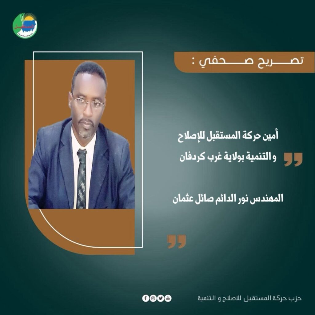 تصريح صحفي من أمين حركة المستقبل للإصلاح و التنمية بولاية غرب كردفان المهندس نورالدائم صائل عثمان ، حول مجريات العمليات العسكرية بكردفان